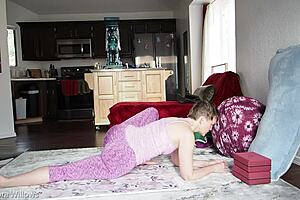 Petite brunette performs short gym routine in leggings showing small tits and narrow ass