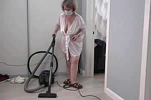Chubby mature milf teases thick ass and saggy tits under short robe
