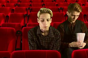 Cinema hall threesome features 2 tops dominating 1 bottom 😈