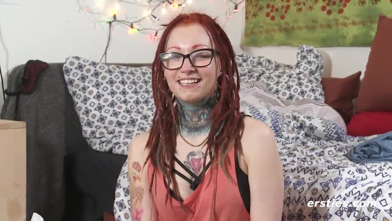 redhead with piercing and tattoo in dress shows something intriguing